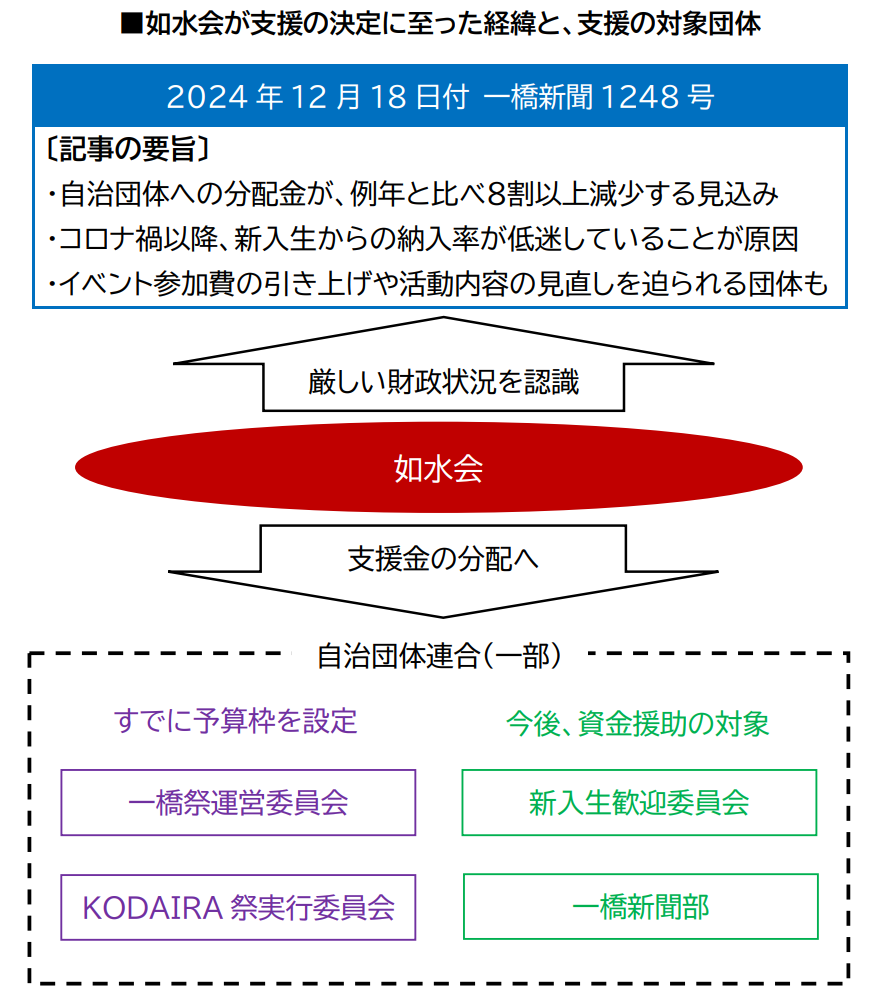 新入生歓迎委員会、一橋新聞部も資金援助の対象となっている。